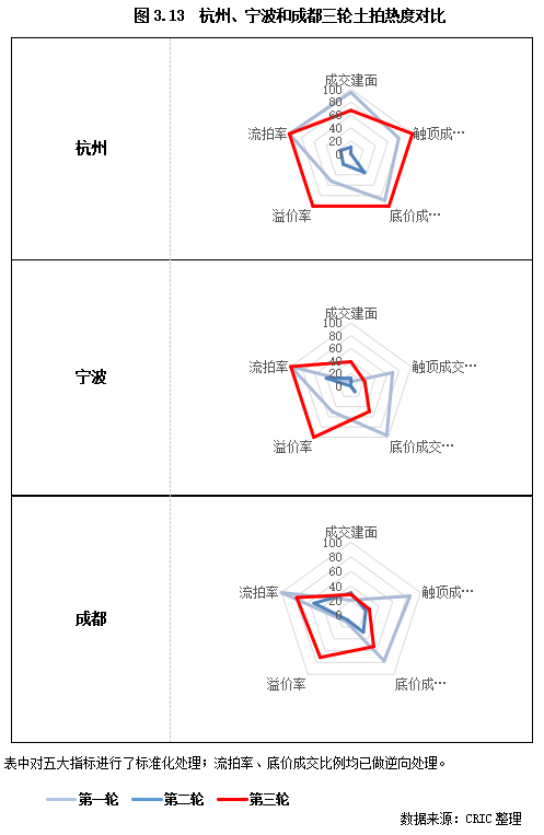 結合五個指標來看,第三輪集中土拍明顯回暖的城市僅有三個,分別是杭州、寧波和成都。相比第二輪,三個城市第三輪觸頂成交地塊比例明顯增加,溢價率也紛紛回漲到5%左右,并且流拍現象也較第二輪得到極大的改善,僅成都7幅地塊遭遇提前中止,杭州和寧波則無一宗土地流拍。