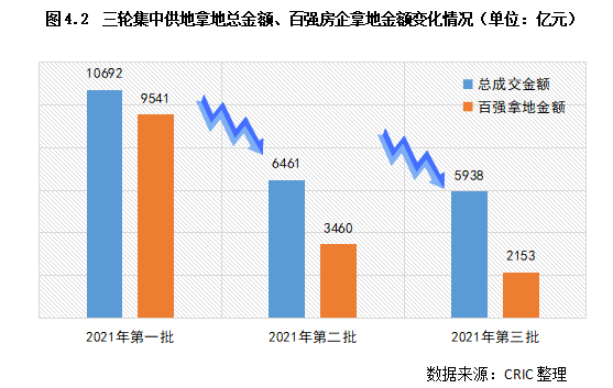 而百強房企的投資力度收縮則更為“夸張”,首輪集中供地百強投資額達到9541億,第二、三輪分別降至3460億和2153億,與首輪相比,降幅分別達到64%和77%。