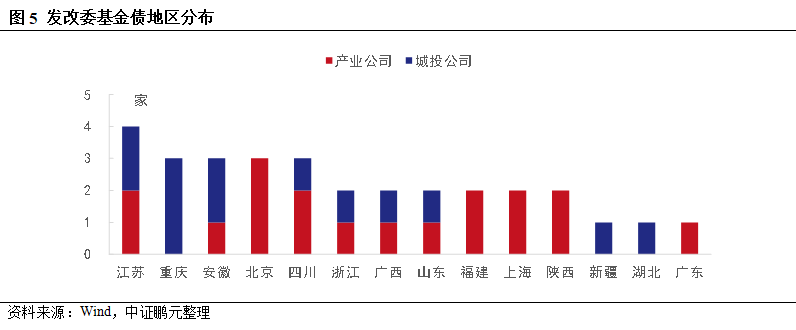 從地區分布看,目前有14個省份參與發行了發改委基金債,其中,江蘇省4家,數量最多,其次是重慶、安徽、四川和北京,分布有3家。從區域內公司屬性看,重慶、安徽的城投占比較高。