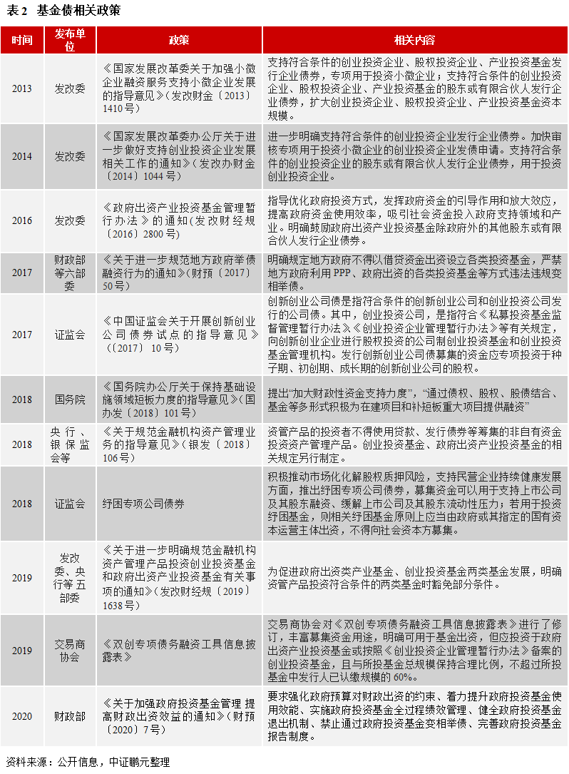 基金債發展歷程:通過債權融資設立或擴大基金融資,首次出現在2005年發改委、科技部等聯合頒布的《創業投資企業管理暫行辦法》。2013年發改委為支持小微企業發展,明確鼓勵創業投資企業、股權投資企業、產業投資基金發行企業債直接或間接投資于小微企業。2016年發改委發布《政府出資產業投資基金管理暫行辦法》,明確鼓勵政府出資產業投資基金除政府外的其他股東或有限合伙人發行企業債券。2016-2017年股權投資市場出現快速發展。2018年資管新規出臺后,普通私募基金的債券融資渠道關閉,股權投資市場規模開始下降。2019年央行等五部門發布的《關于進一步明確規范金融機構資產管理產品投資創業投資基金和政府出資產業投資基金有關事項的通知》明確,符合一定條件的創業投資基金、政府出資產業投資基金,可以部分豁免資管新規?;饌l行受政策鼓勵出現增長。2020年財政部發布《關于加強政府投資基金管理 提高財政出資效益的通知》,進一步規范政府投資基金,要求強化政府預算對財政出資的約束、著力提升政府投資基金使用效能、實施政府投資基金全過程績效管理等。
