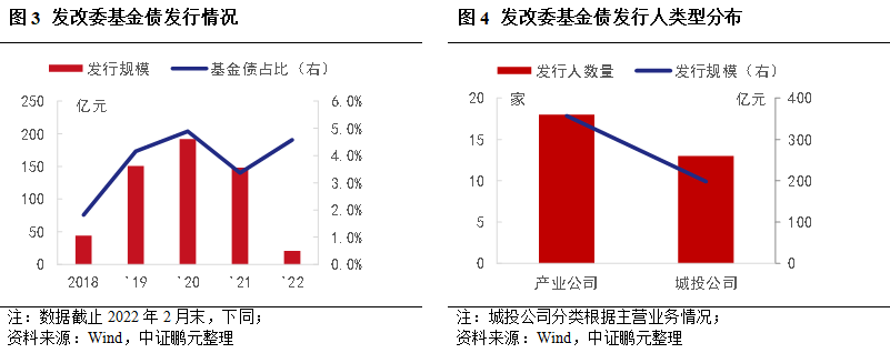 2018年后基金債發行規模出現快速上升,2020年達到191.90億元,隨后出現下降。整體看,2018年-2022年2月,共發行基金債47只,發行規模555.10億元,涉及31家發行人?;饌谄髽I債的占比較低,2020年為4.9%。2022年經濟下行壓力加大,企業再融資難度上升,基金債發行占比提升至4.6%。
