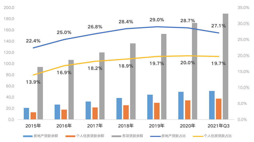 從各項貸款占比來看,2021年三季度末,全國房地產(chǎn)貸款余額占各項貸款余額的比重進一步回落至27.1%,較2020年末再降1.6個百分點。其中,個人住房貸款余額占各項貸款余額的比重跌至19.7%,較2020年末減少0.3個百分點。