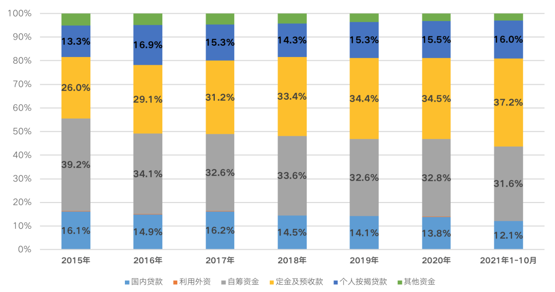 從國家統(tǒng)計局公布的數(shù)據(jù)來看,前10月,房地產(chǎn)開發(fā)企業(yè)到位資金16.7萬億元,同比增長8.8%。其中,國內(nèi)貸款同比下降10%至2萬億,占比跌至12.1%;自籌資金同比增長5.1%至5.3萬億,占比跌至31.6%。此外,定金及預(yù)售款同比增長21%至6.2萬億,個人按揭貸款2.7萬億,同比增長9.7%,占比分別提升至37.2%和16%。
