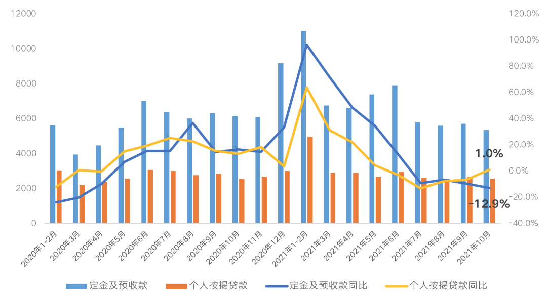 2021年下半年以來,全國房地產(chǎn)市場持續(xù)降溫,企業(yè)銷售回款同樣陷入增長困境,房企資金周轉(zhuǎn)壓力不斷加劇。2021年10月,定金及預(yù)收款新增5351億元,同比下降12.9%,個人按揭貸款新增2554億元,同比增長1%,相較于上半年兩位數(shù)以上的高增長態(tài)勢可謂一落千丈。