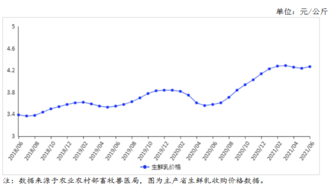 在乳制品行業(yè)中,原奶價格始終是成本大頭。原奶主要指的是生鮮乳,也是白奶、酸奶等液態(tài)奶的主要原料。下圖是近三年來生鮮乳價格走勢圖,可以看出,價格自18年6月以來產(chǎn)品價格一直處于震蕩攀升狀態(tài)。尤其是自去年年中以后,價格明顯步入加速上升狀態(tài)。