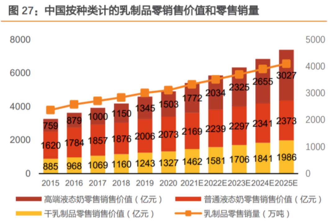 從整個乳制品行業(yè)銷售占比看,高端液態(tài)奶占比持續(xù)增加。根據(jù)天風證券研報顯示,高端液態(tài)奶在全部液態(tài)奶中的占比自2015年的31.9%增至2020年的42%,且有望于2025年占比超過一半。