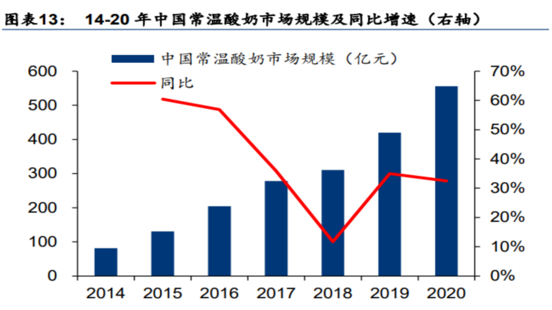 當然,安慕希的成功與常溫酸奶市場的快速增長離不開。根據(jù)智研咨詢數(shù)據(jù),2015-2020年我國常溫酸奶規(guī)模CAGR高達33.7%,市場規(guī)模接近550億。
