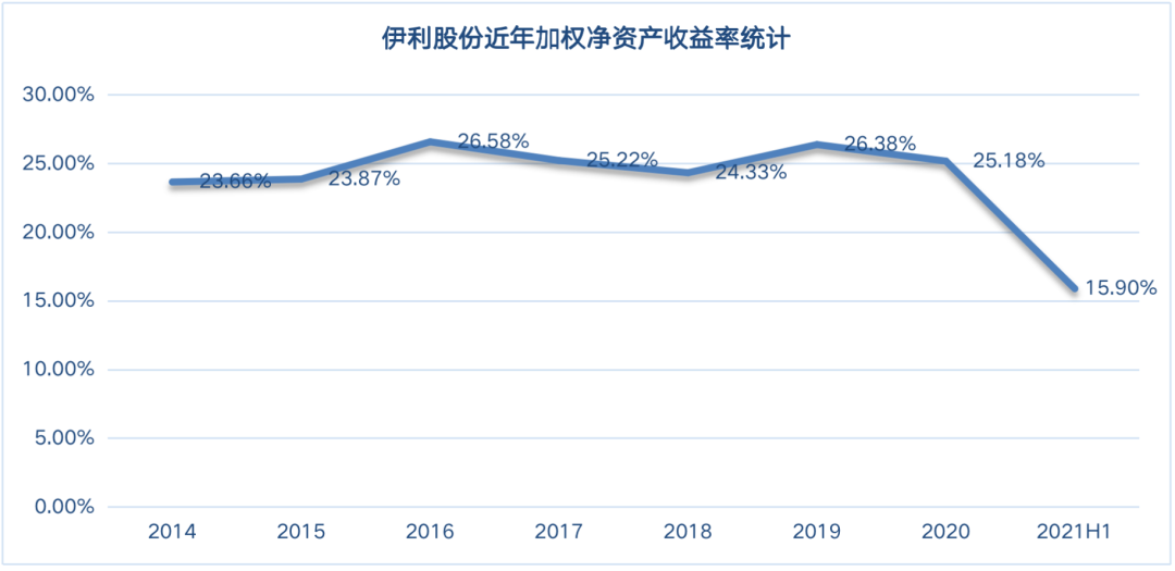 從投資角度看,伊利加權(quán)凈資產(chǎn)收益率2021年上半年為15.9%,同比增長2.62%,該數(shù)值創(chuàng)出自2012以來最高,如果全年凈資產(chǎn)收益率按上半年兩倍算,折合年化就是31.8%,同樣也是最高。這樣的收益率水平放眼A股也是屈指可數(shù)。