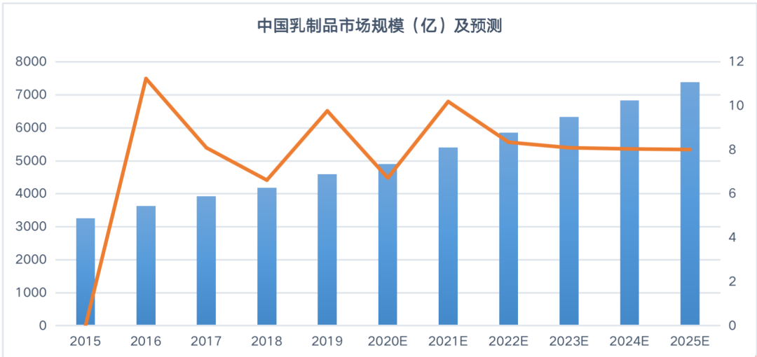 同時根據(jù)天風證券研究結(jié)果顯示,預(yù)計2021年乳制品市場為5403億元,并預(yù)計2025年將達到7385億元,2020年至2025年的CAGR為8.5%,整體增長也將趨于穩(wěn)定。