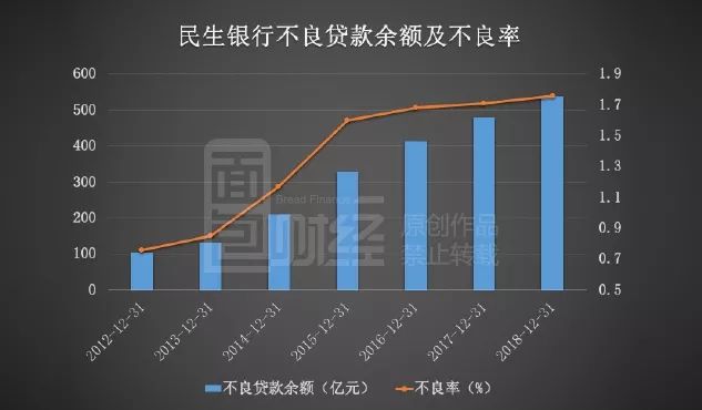 年報(bào)顯示,截至2018年底,民生銀行的不良貸款余額為538.66億元,較上年同期增加了59.77億元,增幅為12.48%。不良率為1.76%,較上年末上升0.05個(gè)百分點(diǎn)。