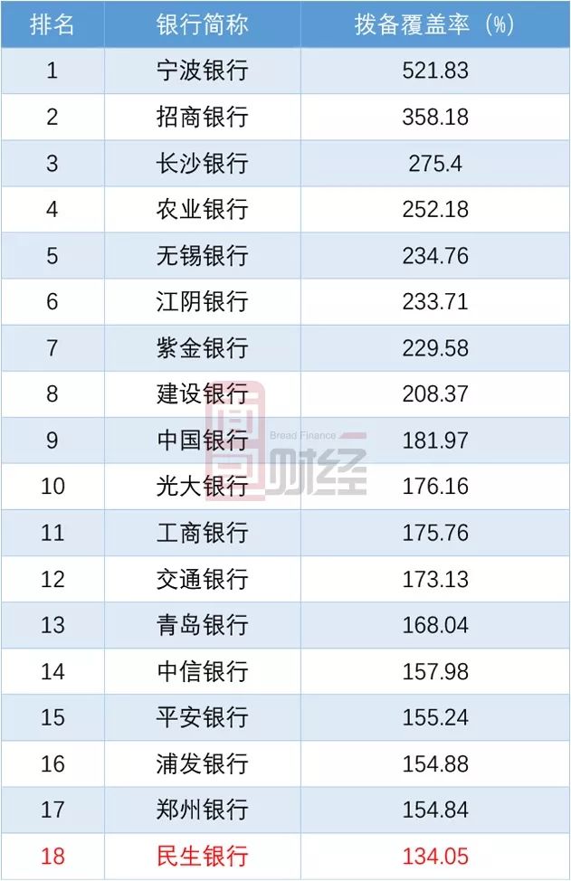 從目前已發(fā)布年報(bào)的18家上市銀行來(lái)看,民生銀行的撥備覆蓋率最低: