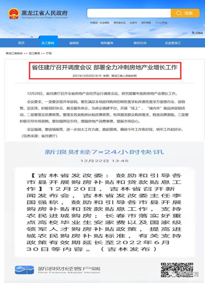 例如,2021年12月20日,黑龍江省政府發(fā)布《省住建廳召開調(diào)度會議部署全力沖刺房地產(chǎn)業(yè)增長工作》(21日這一新聞便官網(wǎng)被撤下),稱黑龍江省住建廳召開全省房地產(chǎn)業(yè)經(jīng)濟運行調(diào)度會議,要求要想辦法促銷售,落實購房補貼政策,提振市場信心。