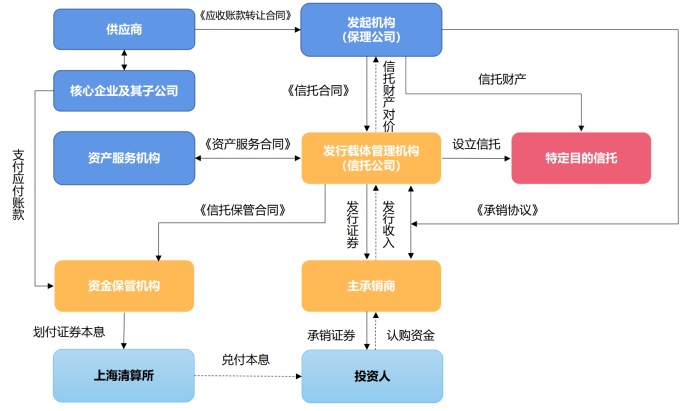 1、該等應收賬款債權系指基礎交易的賣方/承包人/出租人(以下簡稱“債權人”)與基礎交易的的買方/工程發包方/承租人(以下簡稱“債務人”)訂立的有關境內貨物貿易和服務貿易、工程建設、租賃等合同性法律文件,基礎交易的債權人對基礎交易的債務人享有的請求支付對應價款的權利。該應收賬款債權為整個資產支持票據的基礎債權。 (1)轉讓一手的情形,鐵建下屬成員單位作為基礎交易的債務人,與基礎交易的債權人發生貨物/服務貿易、工程承包、租賃業務等交易,對后者負有支付價款的義務,將該應付賬款在鐵建供應鏈金融服務平臺為其開具銀信。 (2)轉讓2-N手的情形,鐵建下屬成員單位對基礎交易的債權人負有應付賬款(該應付賬款金額與所開具銀信金額一致),并與基礎交易的債務人共同在中國鐵建供應鏈金融服務平臺上申請將該應付賬款以應付賬款-應收賬款債權的形式開具給基礎交易的債務人?;A交易的債權人持有銀信后,將該銀信轉讓給基礎交易的債務人,作為貨物/服務貿易、工程承包、租賃業務等基礎交易的價款支付的對價。 3、銀信持有人將該銀信直接轉讓給鐵建保理申請融資,或轉讓給其他銀信受讓人,經過2-N手轉讓,最終持有銀信憑證的銀信持有人作為融資人,將其所持有的應收賬款債權轉讓給鐵建保理,并與鐵建保理簽署《銀信商業保理融資協議》,鐵建保理合法合規受讓該等應收賬款債權。 4、鐵建保理將該應收賬款債權信托/轉讓給上海信托設立中鐵建商業保理2018年度第一期銀信供應鏈資產支持票據信托并發行支持支持票據。 |