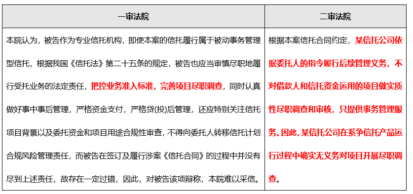 不難發(fā)現(xiàn), 一審法院根據(jù)《信托法》第二十五條, 仍然認(rèn)為無論是通道或主動管理的產(chǎn)品, 受托人均負(fù)有盡職調(diào)查義務(wù), 換言之在一審法院的觀點中其實并沒有主動或通道的區(qū)別, 可以說是將“通道不免責(zé)”的監(jiān)管要求貫徹到底。但二審法院的態(tài)度顯然就緩和得多了, 上海金融法院仍然認(rèn)可了信托合同的約定, 依據(jù)合同約定, 認(rèn)定某信托公司確實不負(fù)有盡職調(diào)查義務(wù)。