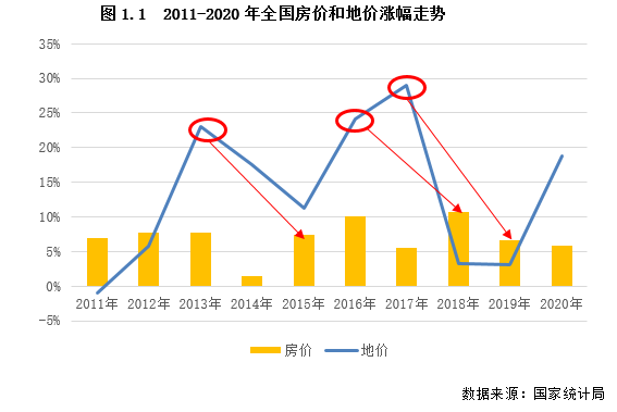 決定房價的因素多種多樣,但在諸多因素之中,拿地成本是決定房屋售價的重要因素之一。從歷史成交數據來看,2011年~2020年十年間地價漲幅共有三次高點,分別是2013年、2016年和2017年。結合房價走勢來看,在地價快速上漲年后,一般兩年后則會迎來房價的加速上升,如2013年地價顯著上漲后,2015年后房價便迎來快速上漲,2016年和2018年情況亦是如此。