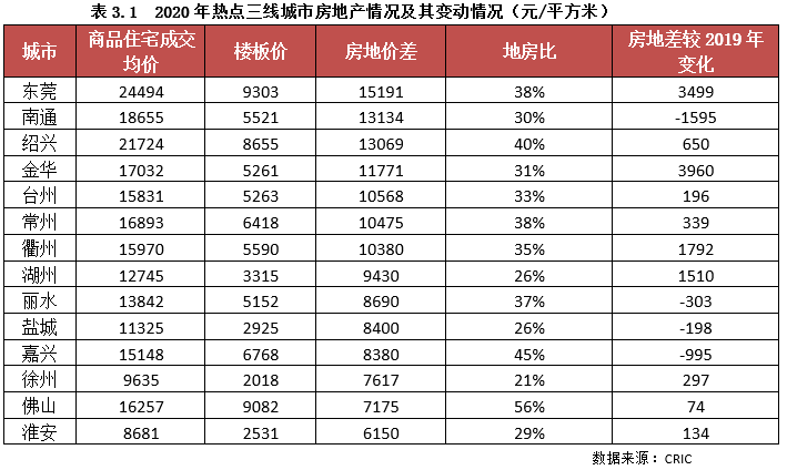 但總體來看,大部分熱點三線城市的房地差均在1萬元/平方米以上,地房比在40%以下,成本風險處于低位。但是如果將2020年房地差與2019年的相比,可以發現,南通、麗水、鹽城、嘉興等城市的房地差是收窄的,尤其是南通,收窄幅度高達1595元/平方米,主要是原因就是由于2020年南通地價過快上漲導致
