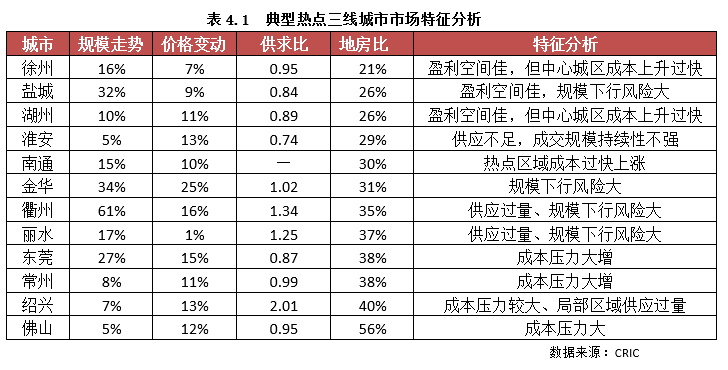 另外,結合上述我們研究的市場周期規律以及其盈利空間綜合評價來看,大多數熱點三線的市場前景仍然較佳,投資風險較低。最值得關注的當屬紹興、南通,兩城均受到長三角一體化利好的影響,在人口吸引力上具有一定的優勢,去化速度較優。但需要警惕的是,由于近年地價過快上漲,成本壓力大,利潤空間被極大的壓縮,尤其是中心城區的優質地塊,盈利空間堪憂。