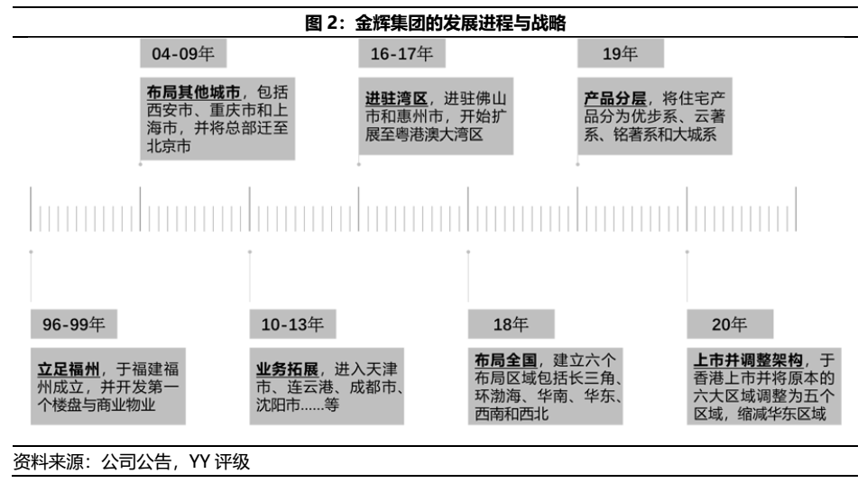 金輝集團的跨區域戰略布局緩慢,自96年于福州成立后至16年進駐緊鄰的灣區花了20年,其中或有02年與融僑合作致使金輝自有品牌布局較慢所致,但對于核心城市的全國化布局仍稍顯緩慢。與其他房企自一線城市串聯至二三線城市的模式不同,金輝集團早期布局上海并遷總部于北京后,其發展區域圍繞著西北、西南和東北區域,而非自一線有序下沉至二三線,此一節奏或為導致金輝集團的發展滯后于其他知名房企的主因。
