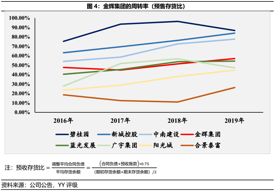 金輝集團在經營層面周轉率指標表現中庸,雖無法企及碧桂園的周轉率,但仍在行業標準水平。