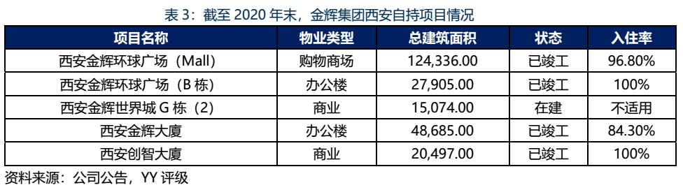 自各城市待售建面(權益口徑)統計可見,除了西安區域待售建面遠超于各城市,其余城市的待售建面較為平均。金輝集團的重倉西安策略或與集團為了解決土地成本問題有關,除了一般的住宅和公寓產品外,金輝集團的西安區域業態亦存在較多的持有型物業,致使截至20年末待銷售建面達431.40萬平米,約等于20多個中型樓盤。