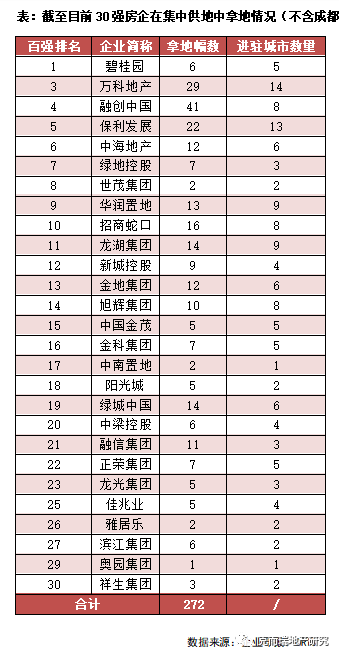 PS:截止到目前,TOP30房企在集中供地城市攬地272宗,占全部地塊比重超四成。TOP50房企共有42家在集中供地中有所斬獲。