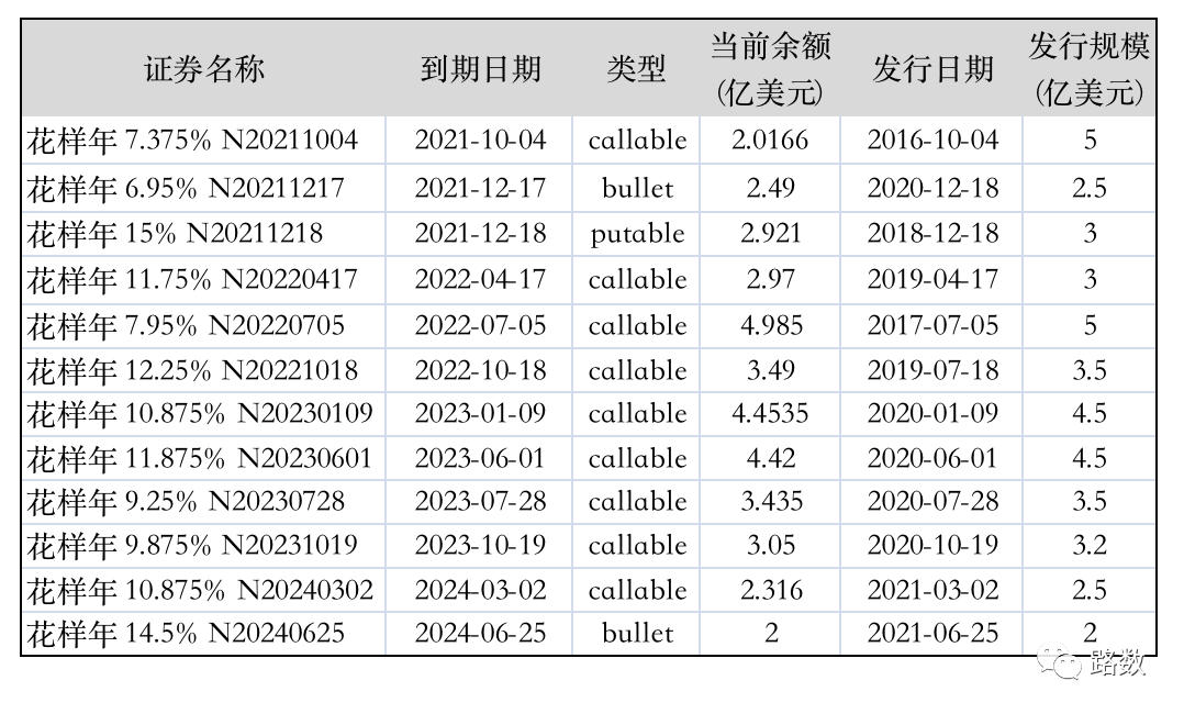 在美元債占總融資結構比重超過50%的若干房企中,花樣年還要加上條:集中兌付壓力。