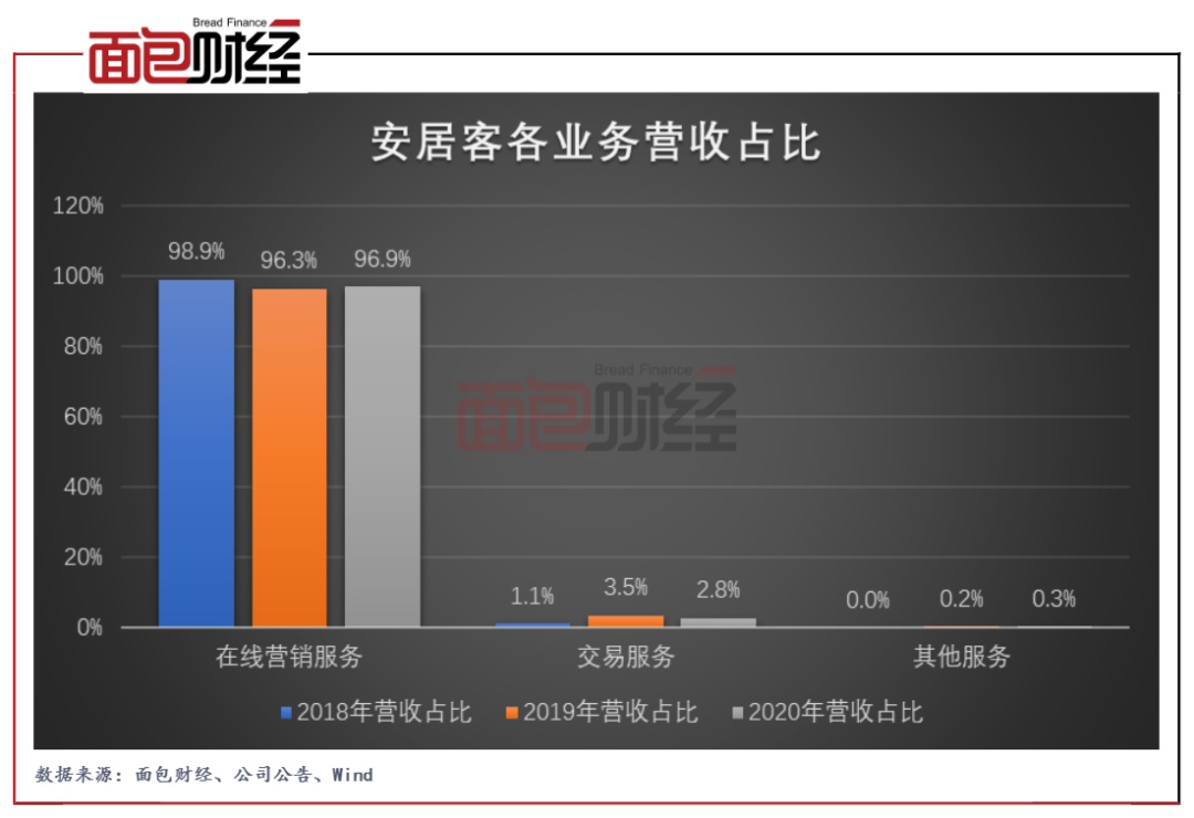 交易服務則主要來自于從開發商賺取的新盤銷售傭金,2020年貢獻收入2.28億元,營收占比2.8%。可以看到,安居客的營收高度依賴于在線營銷服務。
