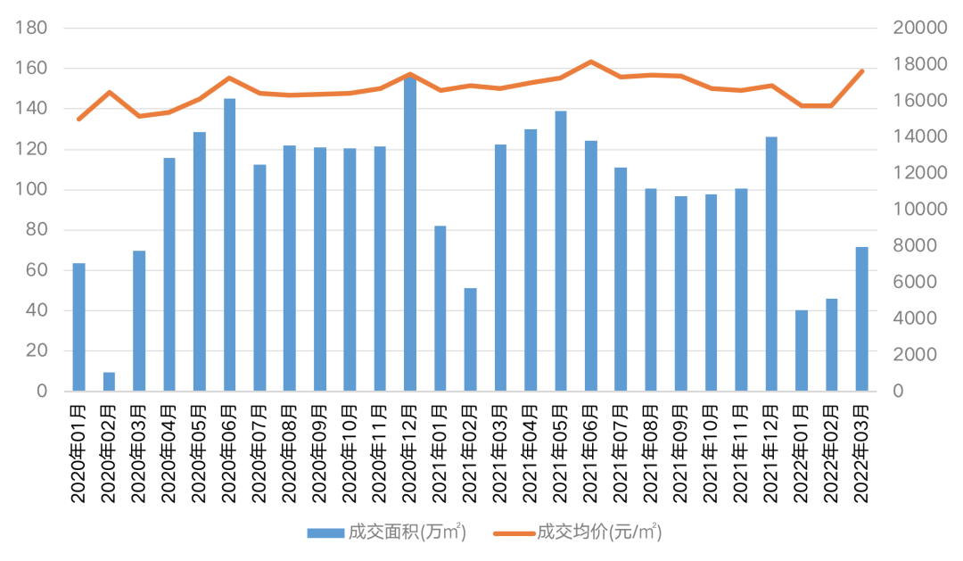 圖:2020年1月-2022年3月杭州商品住宅成交量價(萬平方米、元/平方米)
