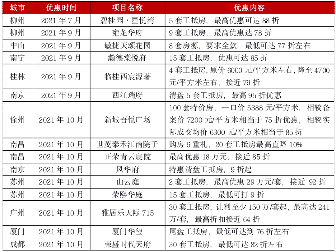 今年以來,地方市場分化加劇,房企自年初以來一貫采用“集團造節+精準讓利”的策略,整體折扣力度較小,僅有少數特價房力度較大。“工抵房”這一產物已連續多年屬于小眾營銷手段之一,很少被房企采用。若是房企能夠成功銷售去化,或者有足夠的資金結算工程款項,并不會出現大量“工抵房”入市的情況。“工抵房”的大量入市說明市場的下行和房企資金的嚴重短缺,與近期房企頻頻暴雷相互印證。