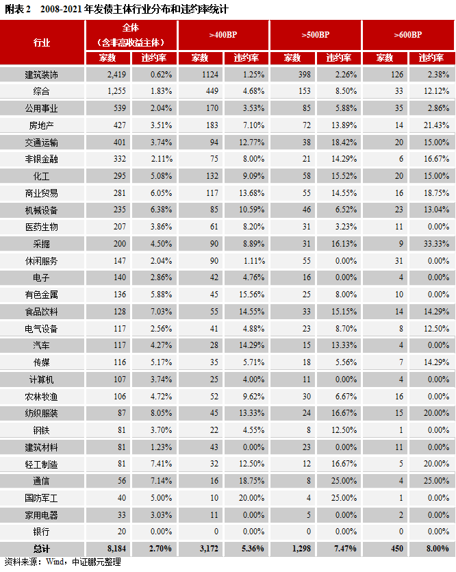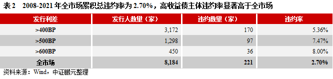 ①高收益主體違約率顯著高于全市場。2008-2021年全市場信用債發行人的總違約率為2.70%,而發行利差>400BP的發行人違約率為5.36%。