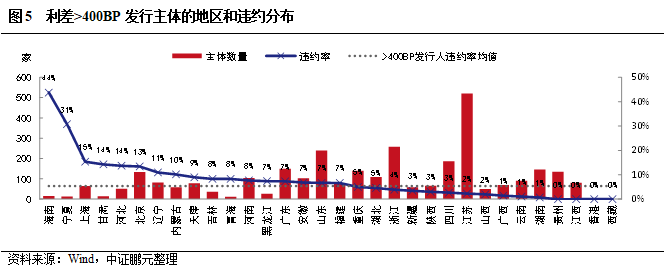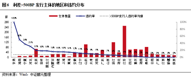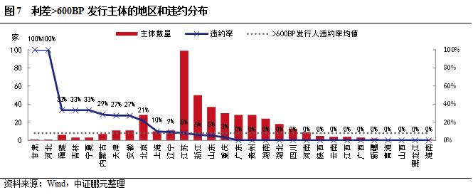 我們再來看一下高收益債發行主體在各地區的分布和違約特征。從絕對數量來看(圖3),江蘇是高收益債主體的絕對大省,主體數量高達521家,是第二名的兩倍之多,占整體高收益債主體的16.4%;其次是浙江和山東,均在200家以上。在利差>400BP(圖5)、>500BP(圖6)、>600BP(圖7)三組高收益主體中,江蘇、浙江、山東均是排名前三。重慶以140家躍居第七名,其它網紅地區如貴州、云南、天津則分別以135家、91家、78家分居第八、十三、十六位。