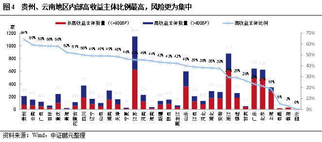 ②高收益主體的企業性質方面,國企占比高、但國企違約率低。地區分布方面,發債大省的江蘇、浙江高收益主體違約率較低,山東則偏高;網紅高風險地區的貴州、云南高收益主體比例最高,區域內高風險主體集中,但目前違約率極低。行業分布方面,建筑裝飾、綜合、房地產、公用事業是高收益主體數量最多的四個行業,其中建筑裝飾、公用事業這兩個城投(或類城投)主要所屬行業的違約率偏低,而房地產及過剩行業的高收益主體違約率相對偏高。