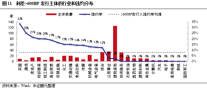 行業分布和違約特征方面,從統計數據來看,建筑裝飾是高收益主體數量最多的行業,僅其一個行業就占全部高收益主體的35%;其次是綜合、房地產、公用事業,也是一級市場高收益債發行主體的主要分布行業(圖8)。前四個行業占全部高收益主體的60%。但建筑裝飾、綜合行業的高收益主體中有較大比例為城投,也就是說有相當數量的弱資質城投其發行利差還是偏高的。