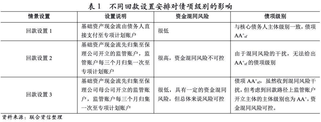 結(jié)構(gòu)化產(chǎn)品另外一個(gè)交易結(jié)構(gòu)的關(guān)注點(diǎn)就是基礎(chǔ)資產(chǎn)現(xiàn)金流的回款路徑和劃款頻率。眾所周知,國(guó)內(nèi)資產(chǎn)證券化產(chǎn)品由于在法律等方面很難做到完全的破產(chǎn)隔離,基礎(chǔ)資產(chǎn)現(xiàn)金流和資產(chǎn)服務(wù)機(jī)構(gòu)的其他現(xiàn)金流容易出現(xiàn)資產(chǎn)混同?,F(xiàn)有緩釋這類風(fēng)險(xiǎn)的主要方式就是控制回款路徑和劃款頻率。也就是說,回款現(xiàn)金流從產(chǎn)生至歸集到專項(xiàng)計(jì)劃賬戶的路徑和頻率是結(jié)構(gòu)化產(chǎn)品需要重點(diǎn)把控的環(huán)節(jié)。單一債務(wù)人供應(yīng)鏈產(chǎn)品也是如此。目前市場(chǎng)上存續(xù)的單一債務(wù)人供應(yīng)鏈產(chǎn)品基本上都能實(shí)現(xiàn)回款現(xiàn)金流閉環(huán),即基礎(chǔ)資產(chǎn)現(xiàn)金流一旦產(chǎn)生,直接回流至專項(xiàng)計(jì)劃賬戶,這種情況下資金混同風(fēng)險(xiǎn)很低。但是評(píng)級(jí)根據(jù)多年的實(shí)踐,在大量的產(chǎn)品結(jié)構(gòu)設(shè)計(jì)中,發(fā)現(xiàn)產(chǎn)品回款設(shè)置存在多樣性,不同的回款設(shè)置帶來高低不一的混同風(fēng)險(xiǎn)。所以即使底層基礎(chǔ)資產(chǎn)償付主體的償付能力和償付安排都相同,但也會(huì)可能由于基礎(chǔ)資產(chǎn)回款結(jié)構(gòu)設(shè)置的不同而導(dǎo)致最終產(chǎn)品面臨不同的償付風(fēng)險(xiǎn),最終影響債項(xiàng)的級(jí)別。