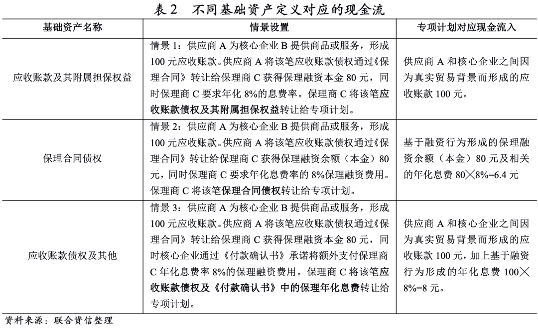 上述情景1中,現(xiàn)金流為供應(yīng)商和核心企業(yè)之間因?yàn)檎鎸?shí)貿(mào)易背景而形成的應(yīng)收賬款,現(xiàn)金流全部來源于核心債務(wù)人及其下屬子公司,交易安排上需輔以相關(guān)確權(quán)文件如債務(wù)人付款確認(rèn)書等以有效保障現(xiàn)金流的信用質(zhì)量,此類情形為目前主流模式。情景2中,有一定可能性會(huì)使得現(xiàn)金流的信用質(zhì)量無法得到核心企業(yè)的主體信用支撐,通常表現(xiàn)為供應(yīng)商將該筆應(yīng)收賬款債權(quán)通過《保理合同》轉(zhuǎn)讓給保理商的行為通知送達(dá)核心企業(yè),但無法獲取核心企業(yè)對(duì)該筆款項(xiàng)的確權(quán)文件,或是無法配合改變現(xiàn)金流劃轉(zhuǎn)路徑,現(xiàn)金流需以原路徑劃轉(zhuǎn)至供應(yīng)商,此種情形下現(xiàn)金流信用質(zhì)量無法得到有效保障,進(jìn)而影響對(duì)債項(xiàng)級(jí)別的判斷。情景3中的入池資產(chǎn)其實(shí)包含了兩種不同形式的基礎(chǔ)資產(chǎn):即由于開展日常真實(shí)貿(mào)易背景形成的應(yīng)收款項(xiàng)和由于開展融資行為而產(chǎn)生的應(yīng)收款項(xiàng)。表格中描述為由核心企業(yè)承諾將額外支付保理商年化息費(fèi)率8%的保理融資費(fèi)用,這種情形結(jié)合確權(quán)文件需要判斷該項(xiàng)行為的商業(yè)合理性,以盡可能避免后續(xù)糾紛。這里也需要說明如該項(xiàng)融資費(fèi)用約定由供應(yīng)商承擔(dān),那么基礎(chǔ)資產(chǎn)所圈定的兩部分現(xiàn)金流事實(shí)上來源于兩個(gè)不同資信水平的主體,無法合并來看。