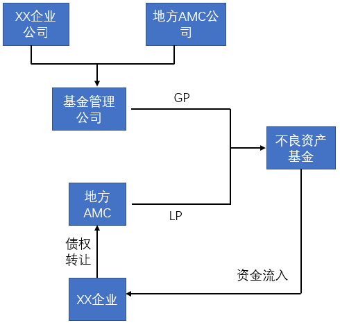 由資金周轉(zhuǎn)困難的公司和資產(chǎn)管理公司合資成立的一般合伙人(GP),與資產(chǎn)管理公司共同組建不良資產(chǎn)處置基金,基金以籌集的資金向陷入困境的公司發(fā)放1億元借款,專項(xiàng)用于其到期部分債務(wù)的替換和轉(zhuǎn)貸,以及生產(chǎn)流動(dòng)性資金支出。
