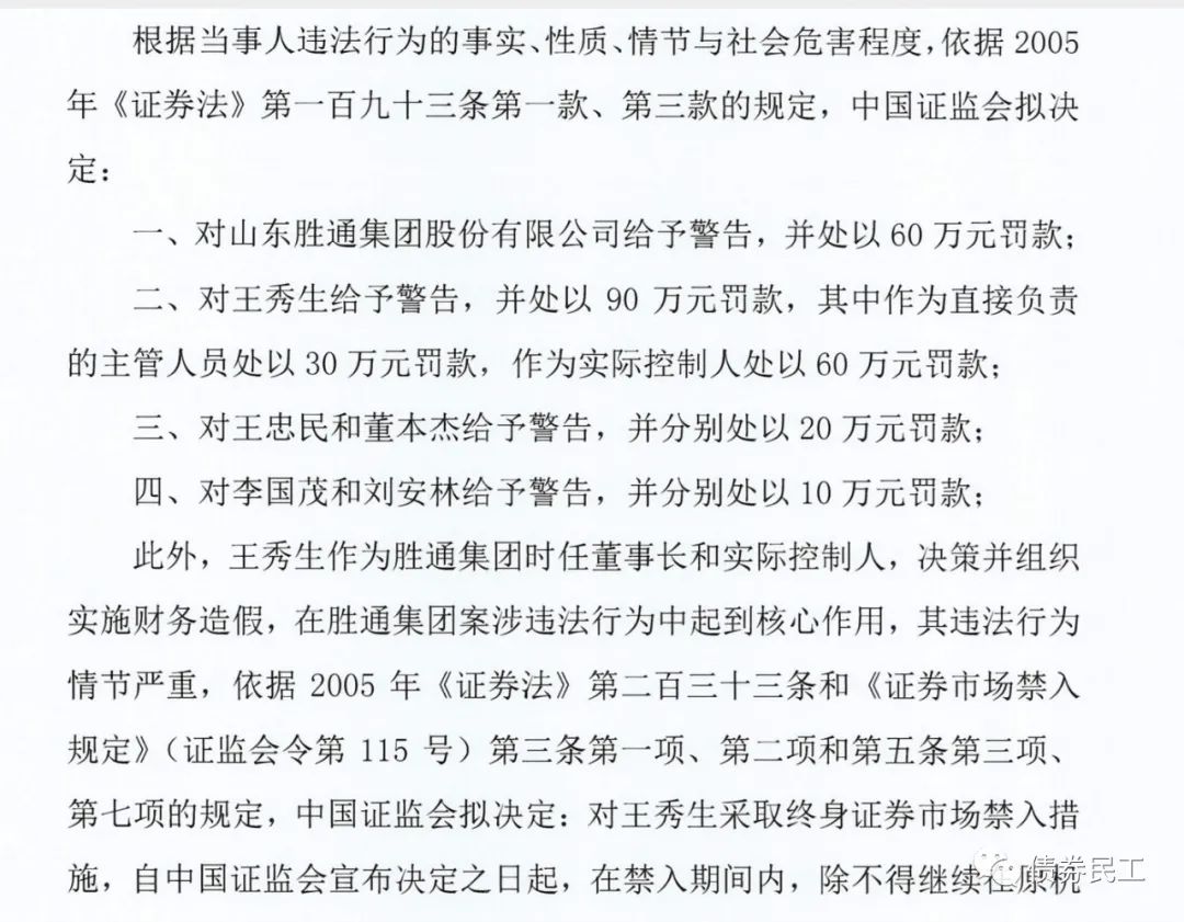 從公開(kāi)披露的文件內(nèi)容看,山東勝通集團(tuán)的財(cái)務(wù)造假方式包括兩方面:制作虛假財(cái)務(wù)賬套等方式虛增收入、成本和利潤(rùn);直接修改2016年度、2017年度經(jīng)審計(jì)后的合并會(huì)計(jì)報(bào)表 的方式虛增利潤(rùn)。中國(guó)證監(jiān)會(huì)對(duì)山東勝通集團(tuán)給予警告并罰款,對(duì)相關(guān)負(fù)責(zé)人給予警告并罰款,對(duì)山東勝通集團(tuán)董事長(zhǎng)和實(shí)際控制人給予終身證券市場(chǎng)禁入措施。