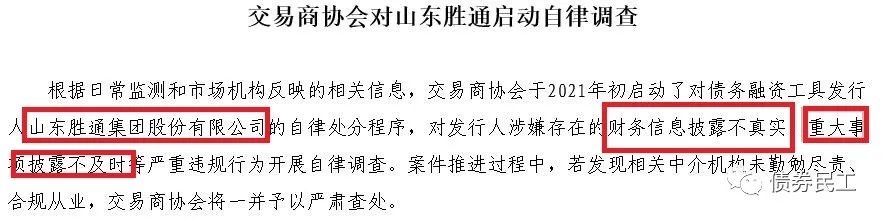 在此之前的2021年4月7日,交易商協(xié)會(huì)已經(jīng)對(duì)山東勝通集團(tuán)對(duì)啟動(dòng)自律調(diào)查,主要原因是“財(cái)務(wù)信息披露不真實(shí)、重大事項(xiàng)披露不及時(shí)”。其中最關(guān)鍵的是財(cái)務(wù)信息披露不真實(shí),可能會(huì)涉嫌財(cái)務(wù)造假等問(wèn)題。