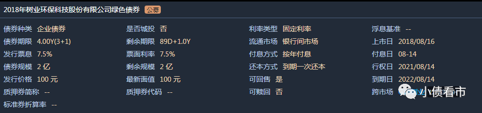 《小債看市》統(tǒng)計,目前樹業(yè)環(huán)保僅存續(xù)1只綠色債券“18樹業(yè)環(huán)保綠色債”,存續(xù)規(guī)模兩億元,將于今年8月14日回售,明年8月14日到期。