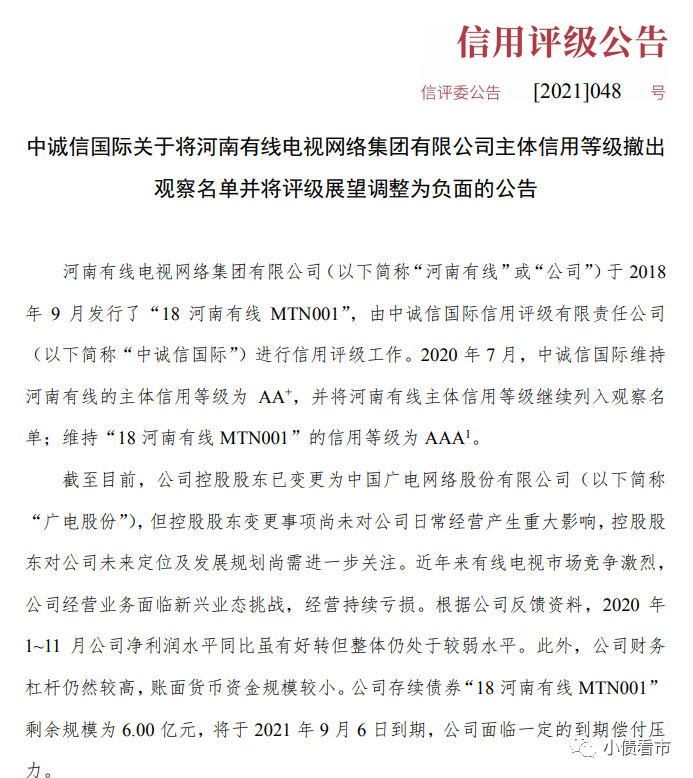 1月19日,中誠信國際公告稱,決定維持河南有線電視網絡集團有限公司(以下簡稱“河南有線”)的主體信用等級為AA+,將上述主體信用等級撤出觀察名單,并將評級展望調整為負面;維持“18河南有線MTN001”的信用等級為AAA。