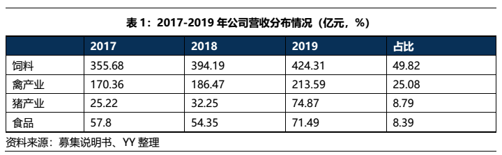 公司以飼料起家,不斷加大養(yǎng)殖與食品端的布局,走多元化與養(yǎng)殖食品一體化的轉(zhuǎn)型之路。目前公司已經(jīng)覆蓋了飼料-養(yǎng)殖-屠宰-食品全產(chǎn)業(yè)鏈,其中飼料為核心業(yè)務(wù),占營收的50%左右,禽養(yǎng)殖、生豬養(yǎng)殖和食品業(yè)務(wù)均已初具規(guī)模,分別占營收的25%、8.8%、8.4%。