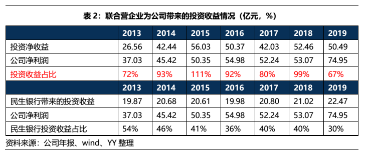 此外,公司投資了較多優(yōu)質(zhì)聯(lián)合營企業(yè),如民生銀行、新網(wǎng)銀行、新希望化工、新希望地產(chǎn)等,每年都能帶來將近50億的凈投資收益,占據(jù)了公司近90%的凈利潤。尤其是民生銀行是優(yōu)質(zhì)金融資產(chǎn),每年都能夠穩(wěn)定地帶來20億左右的投資收益,貢獻了公司40%左右的凈利潤。