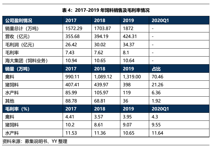 飼料業(yè)務(wù)占營收的50%左右,是公司的支柱業(yè)務(wù),具有明顯的規(guī)模優(yōu)勢,銷量增長穩(wěn)健,但由于產(chǎn)品結(jié)構(gòu)不佳,盈利能力并不強。