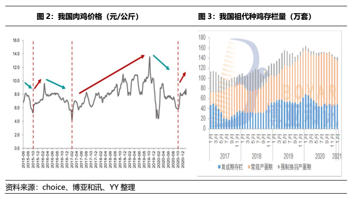 從價格周期來看,肉雞價格在19年11月達到頂峰后就開始一路下行,已經(jīng)調(diào)整了近一年了,祖代雞存欄量經(jīng)過1年的產(chǎn)能出清,已經(jīng)處于較低水平,業(yè)內(nèi)普遍認為21年雞價有望溫和上漲,所以短期內(nèi)公司的禽養(yǎng)殖板塊盈利向好。
