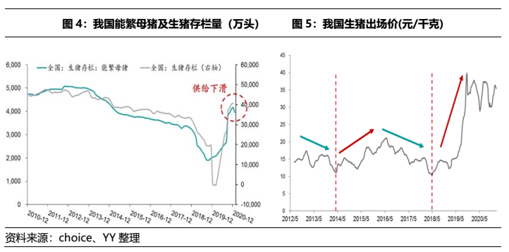 從價格來看, 21年豬肉價格仍有一定支撐。21年初非洲豬瘟疫情多點散發(fā),導(dǎo)致母豬淘汰加劇、存欄量折損,短期生豬產(chǎn)能恢復(fù)受阻,加上春節(jié)前后集中拋售,短期內(nèi)生豬存欄下降,供給偏緊,而節(jié)后補欄情緒高漲,仔豬價格連續(xù)上漲,飼養(yǎng)成本增加,均為21年豬肉價格提供了一定支撐。