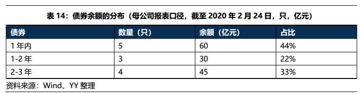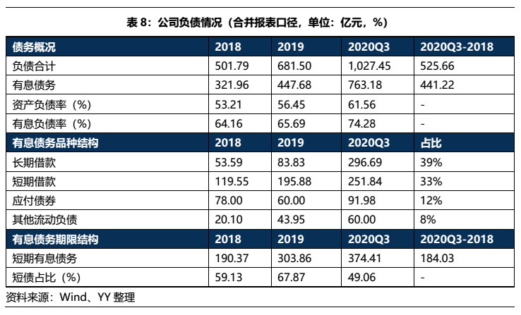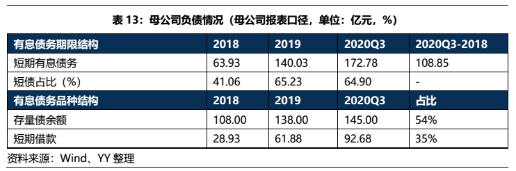 從債務(wù)期限結(jié)構(gòu)上看,短債占比偏高(65%),短期償債壓力偏大;從品種結(jié)構(gòu)來看,以債券和短期借款為主,截至2020Q3末母公司的存量債規(guī)模為145億,占據(jù)有息債務(wù)的54%左右,規(guī)模較大,資本市場依賴度上升。