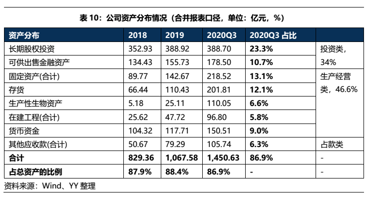 總體而言,公司的資產(chǎn)形成來看經(jīng)營驅(qū)動邏輯清晰。截至20年9月末,公司資產(chǎn)主要為生產(chǎn)經(jīng)營類資產(chǎn)(46.6%)、投資類資產(chǎn)(34%)和其他應(yīng)收款(6.3%)。生產(chǎn)經(jīng)營類資產(chǎn)主要是養(yǎng)殖場等,具有較強的盈利屬性;長期股權(quán)投資共389億,其中有192億為民生銀行、85億為新希望地產(chǎn)、20億為華創(chuàng)陽安,質(zhì)量均較好;所以總體而言公司的資產(chǎn)較硬。