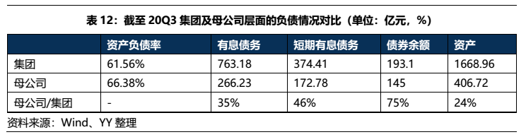 從母公司來看,債務(wù)負擔(dān)比集團更加沉重。母公司沒有實質(zhì)業(yè)務(wù),主要依靠投資收益,截至20Q3末母公司資產(chǎn)僅占集團的24%左右,卻承擔(dān)了35%的有息債務(wù),75%的債券償付壓力都集中在母公司,母公司資產(chǎn)負債率已經(jīng)到66.38%,有息債務(wù)達266億,債務(wù)負擔(dān)較重。