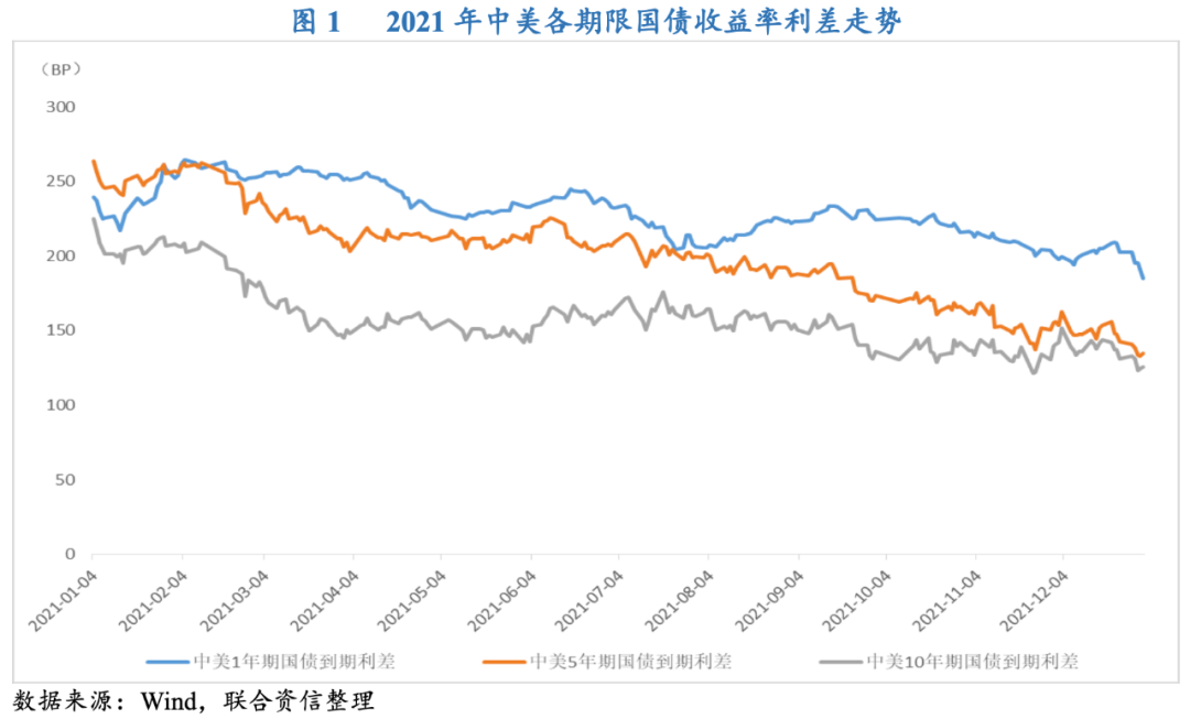 2021年12月召開的2022年中央經濟工作會議中要求繼續實施積極的財政政策和穩健的貨幣政策,2022年穩健的貨幣政策要靈活適度,保持流動性合理充裕。2022年1月中旬,繼去年12月落實全面降準、定向降息后中國央行將1年期MLF和7天逆回購利率分別下調10個BP至2.85%和2.10%,實現全面降息;并在20日將1年期LPR和5年期LPR報價分別下調10個和5個BP至3.70%和4.60%,再次向外界釋放鼓勵企業增加信貸的積極信號。在中國經濟下行壓力持續加大的背景下,央行降息政策表明貨幣政策逆周期調控的力度加大,預計在2022年央行穩健的貨幣政策或將趨向寬松,推動融資成本小幅下行。在中美實施反向貨幣政策的背景下,2022年中美國債收益率利差有望進一步收窄,美元債務融資相對成本優勢大概率將被進一步削弱。