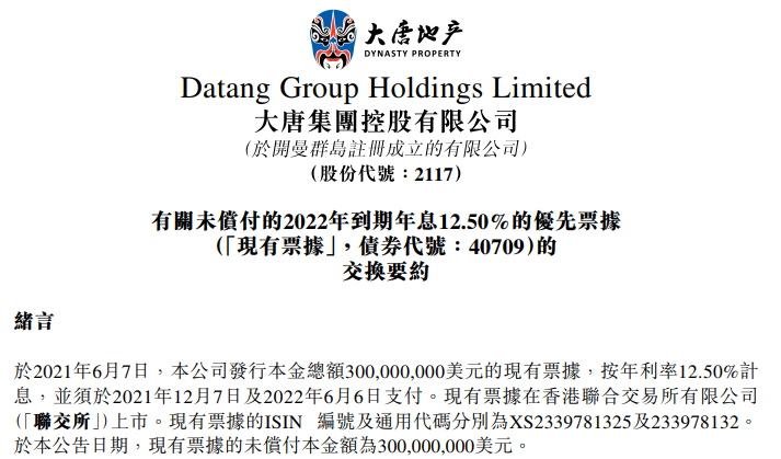 2022年5月23日,大唐集團控股發布公告,擬就旗下一筆美元債未償付本金額的至少2.7億美元或90%發起要約交換。